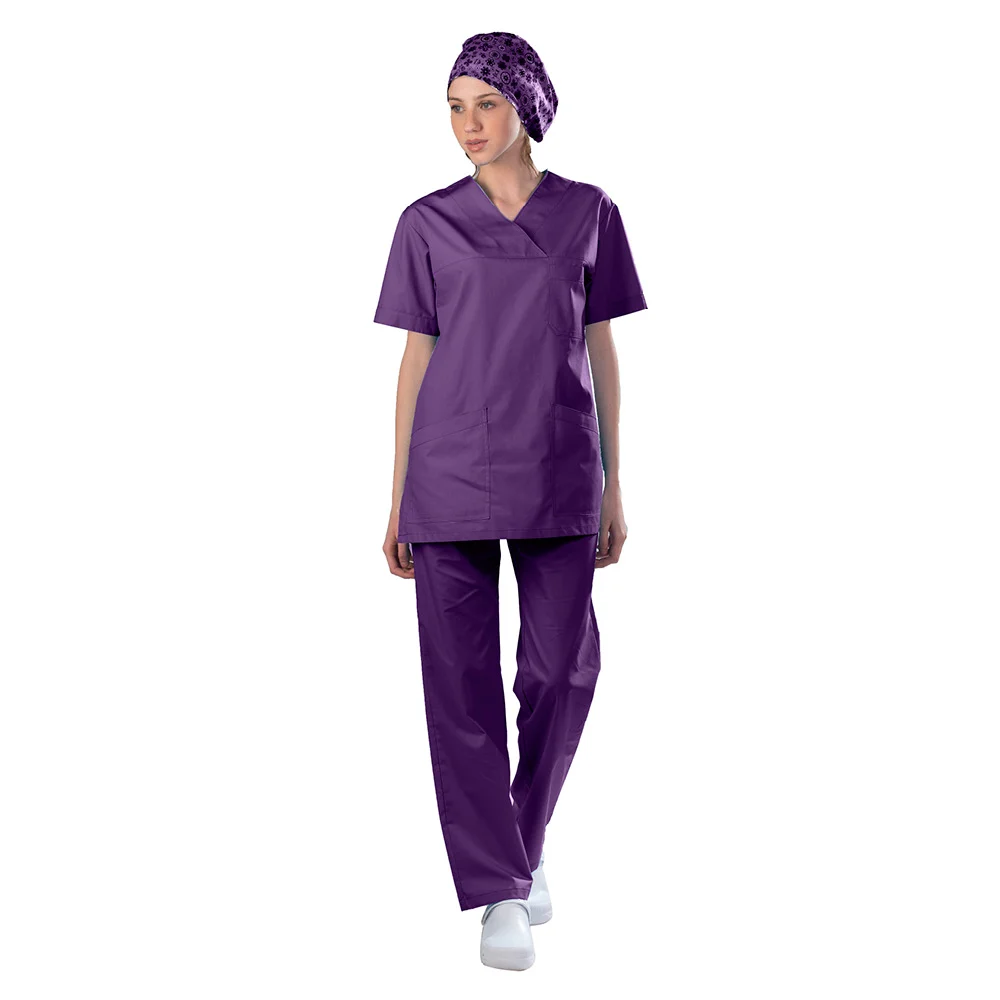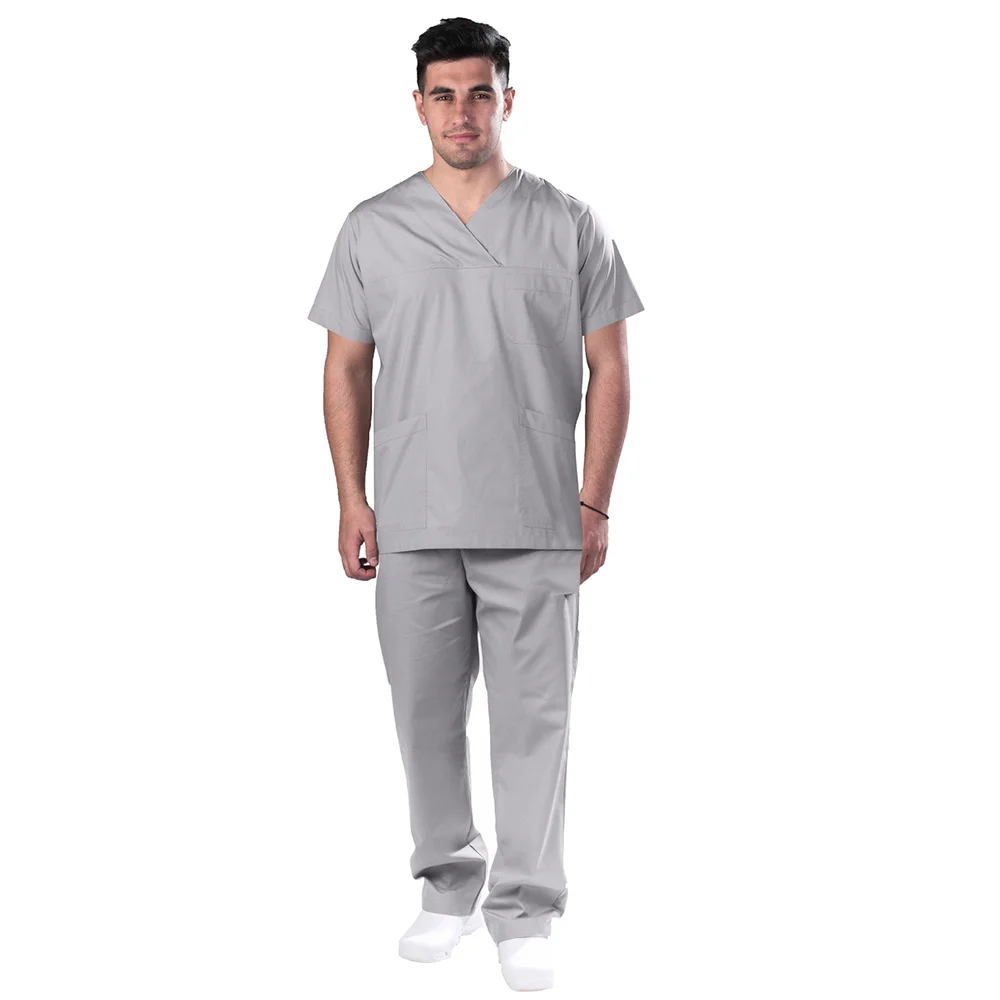 Κουστούμι unisex χρωματιστό αποτελούμενο από χιτώνιο με σταυρωτή V λαιμόκοψη. Μανίκι κοντό, δύο τσέπες κάτω και τσεπάκι στήθους με πλαϊνά σχισίματα για μεγαλύτερη άνεση στις κινήσεις και παντελόνι με λάστιχο και κορδόνι στη μέση και μία τσέπη πίσω.